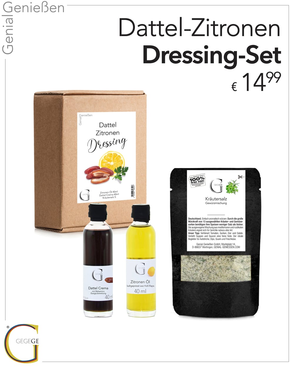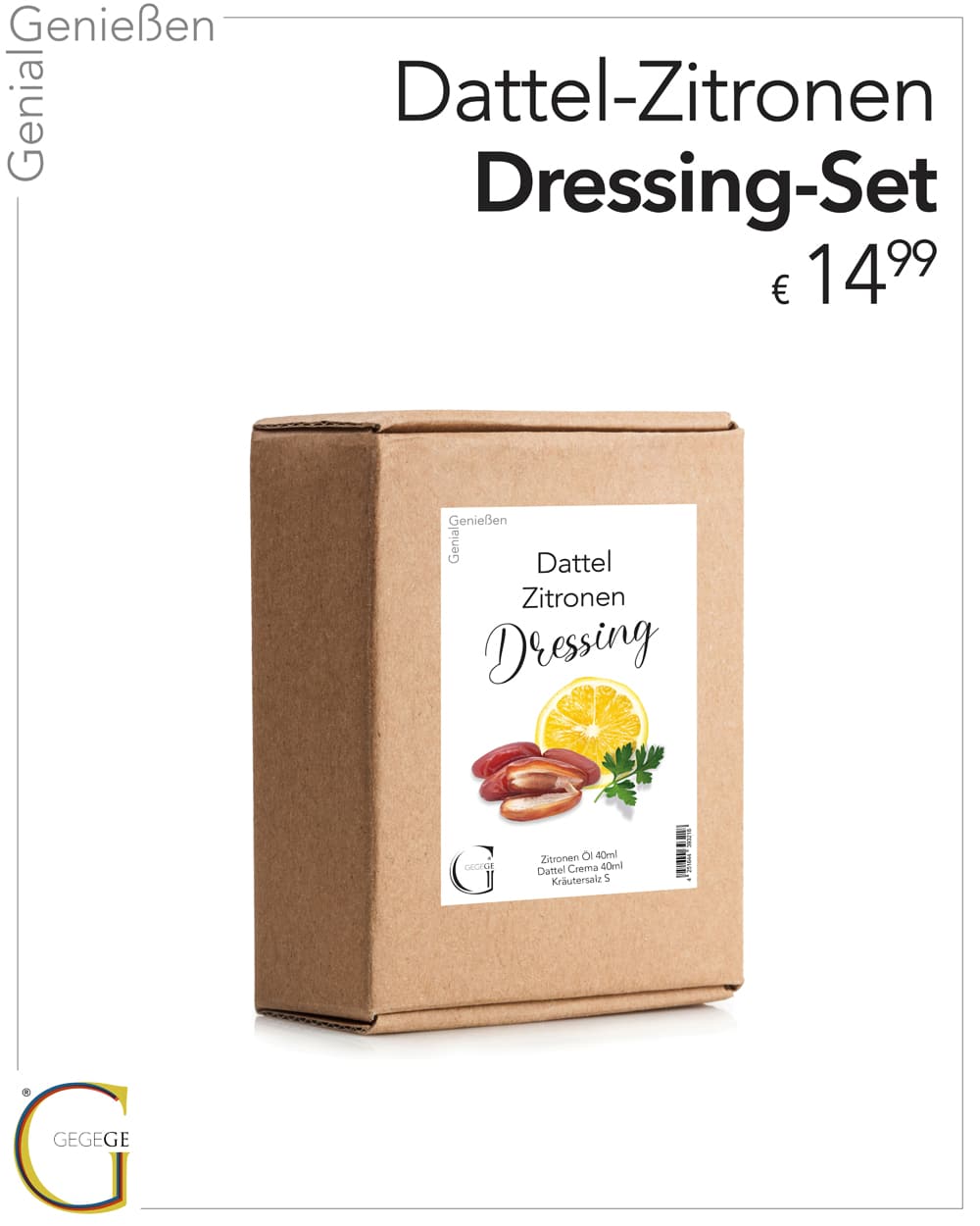 Anwendungstipps - Lieferung in 1-3 Werktagen (B2C)Herkunft: Wertingen.Dieses Dressing-Set bringt frische in deine Salate! Die Kombination aus fruchtigem Zitronenöl , süßlich-milder Dattel Crema und aromatischem Kräutersalz sorgt für eine perfekte Balance aus Frische, Süße und Würze. Genieße im Handumdrehen köstliche Dressings, Salate, Bowls und viele weitere Speisen.