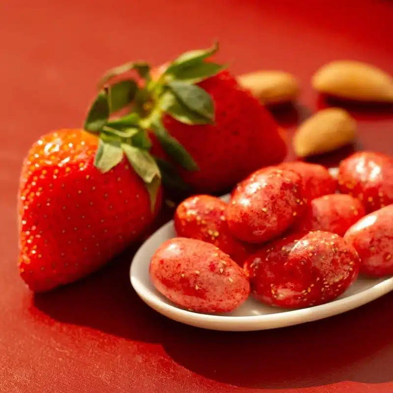Erlebe eine köstliche Kombination aus knackiger Mandel umhüllt von fruchtig-frischer und zartschmelzender Erdbeer-Joghurt-Schokolade! Sorgfältig ausgewählte Mandeln werden mit einer köstlichen Schicht aus feiner Schokolade umhüllt und verleihen jedem Bissen eine perfekte Balance aus Knusprigkeit und zarter Süße.