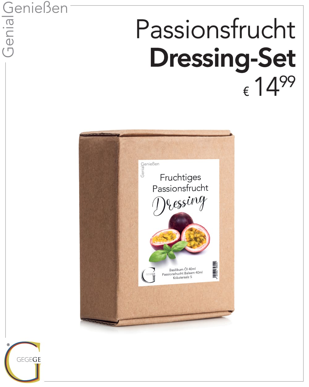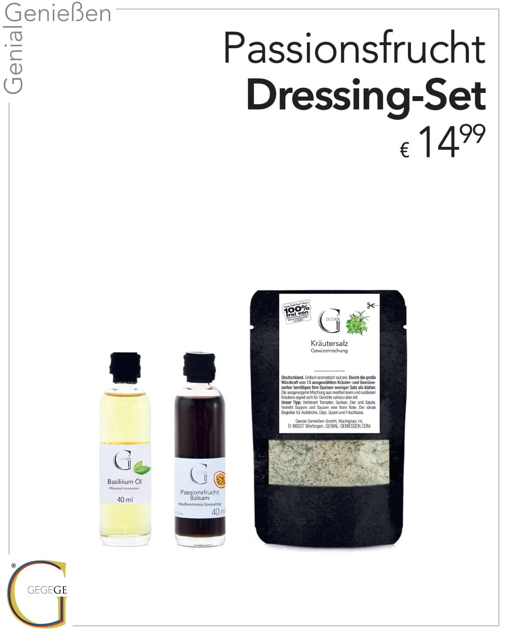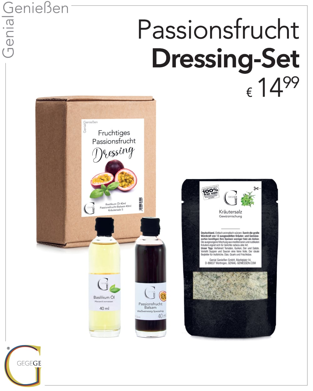 Mildes Basilikum Öl, fruchtig-exotischer Passionsfrucht-Balsam und aromatisches Kräutersalz sorgen für frische Raffinesse auf deinem Teller.