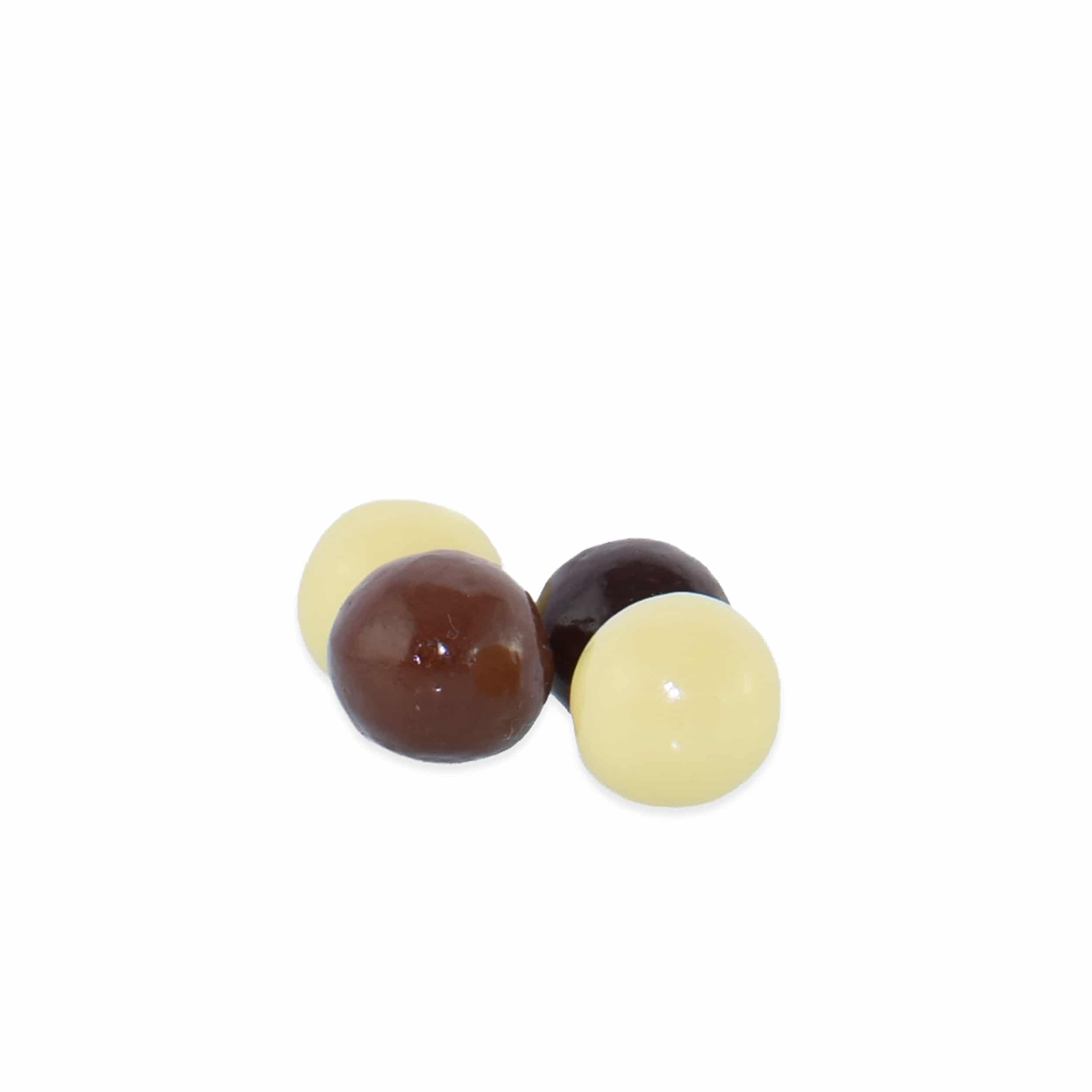 Verkehrsbezeichnung: Reisbällchen in Vollmilch-, Zartbitter- und weißer Schokolade.