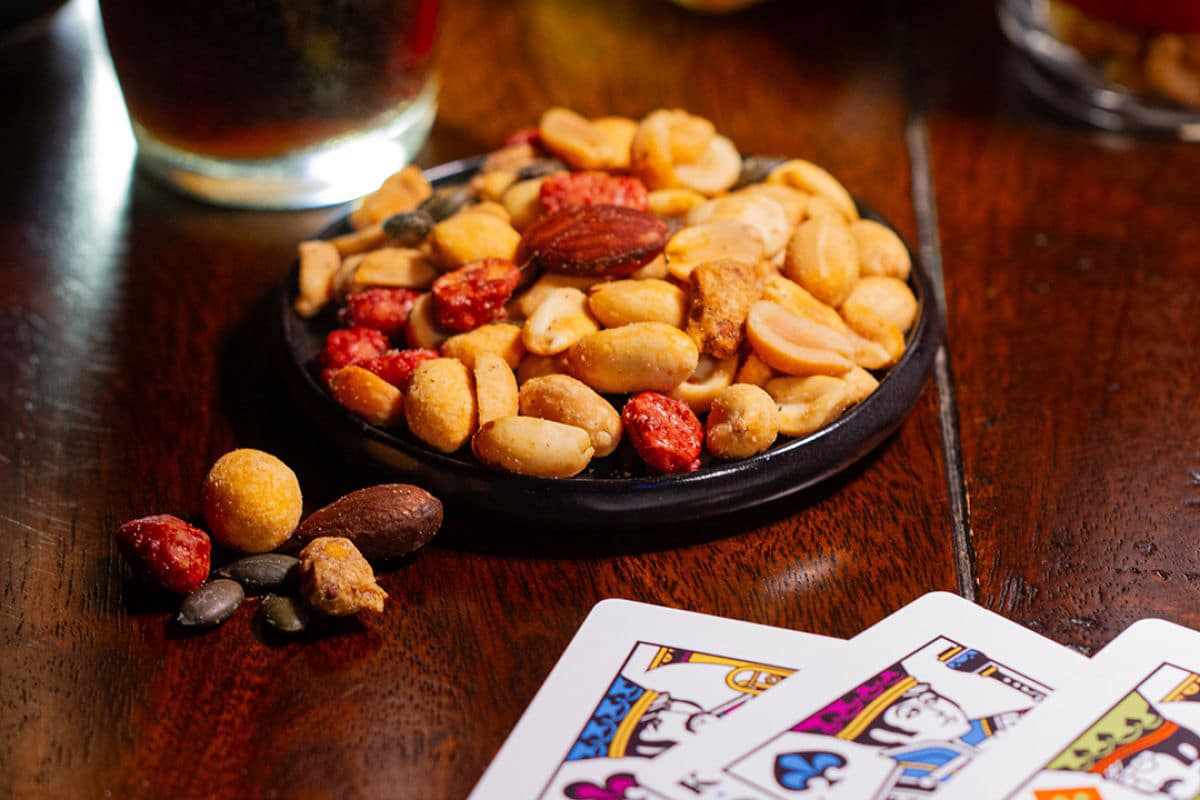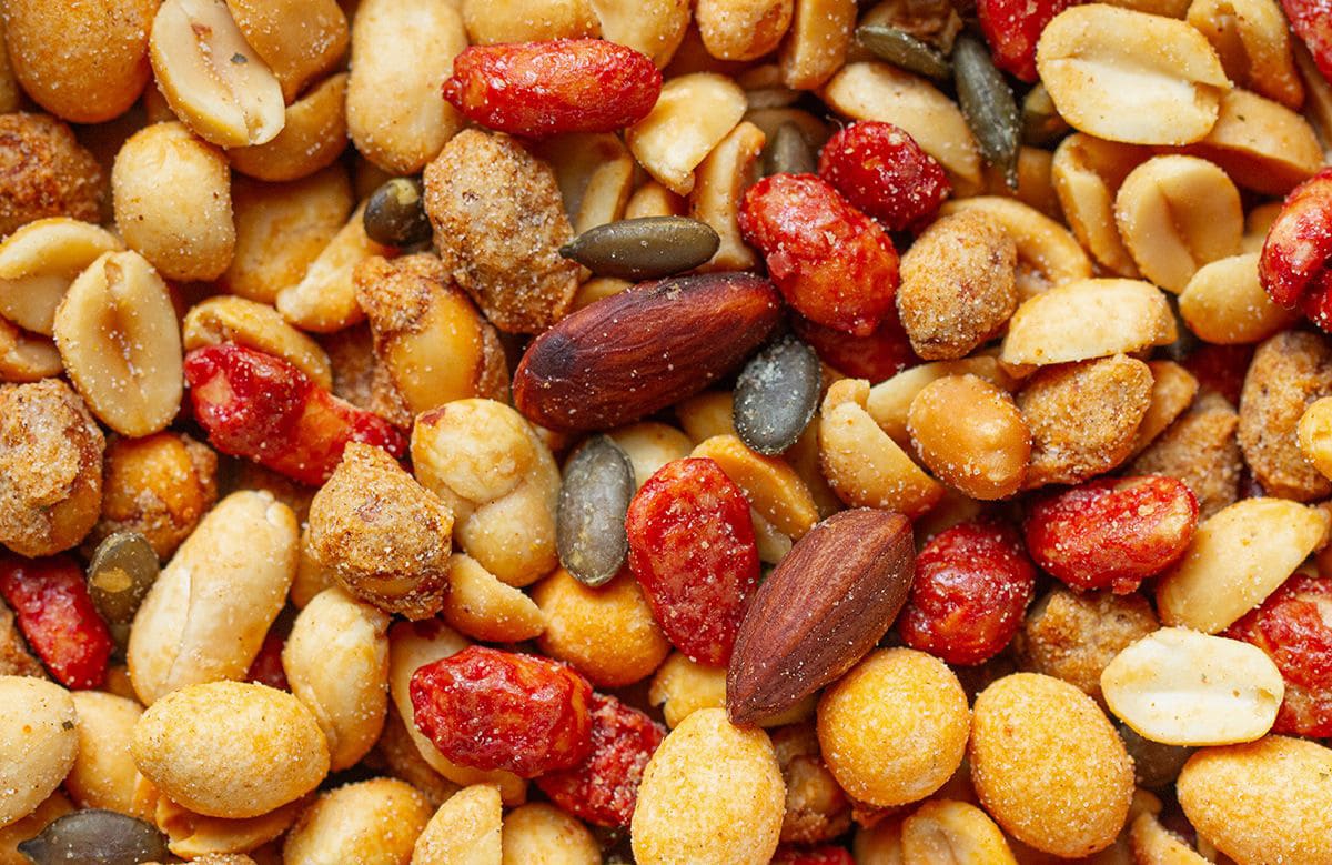frittierte gesalzene Erdnüsse (40%) [Erdnüsse, Sonnenblumenöl, Salz], gewürzte Erdnüsse im Teigmantel (20%) [Erdnüsse (75%), Weizenmehl, Kartoffelstärke, Würzmischung (Gewürze, Paniermehl (Weizenmehl, Salz, Backtriebmittel (Ammoniumcarbonate)), Gewürzextrakt, Trennmittel (Siliciumdioxid), Antioxidationsmittel (stark tocopherolhaltige Extrakte), Kurkumaextrakt), Sonnenblumenöl, Salz, Zucker, Knoblauchpulver, Backtriebmittel (Natriumcarbonate), Weizenprotein], gebrannte Erdnüsse (20%) [Erdnüsse (63%), Zucker, Glukosesirup, Sonnenblumenöl, Stabilisator (Gummi arabicum), Honig, Emulgator (Lecithin), Farbstoff (echtes Karmin)], gewürzte Erdnüsse im Teigmantel (10%) [Erdnüsse (49%), Stärke, Weizenmehl, Sonnenblumenöl, Puderzucker, modifizierte Kartoffelstärke, Salz, Zwiebelpulver, Knoblauchpulver, Chili-Würzmischung (Chili, Kreuzkümmel, Salz Knoblauchpulver, Oregano, hydrolysiertes pflanzliches Protein (Soja, Mais), Curry-Pulver (Kurkuma, Kreuzkümmel, Koriander, Bockshornklee, Fenchelsamen, Chili, Weizen, Maltodextrin, Knoblauchpulver)), Gewürzaromazubereitung (Paprikaextrakt, Chiliextrakt, Cayenneextrakt, Säuerungsmittel (Citronensäure), Farbstoff (Annatto Norbixin)], geröstete Kürbiskerne (5%) [Kürbiskerne, Salz, Stabilisator (Gummi arabicum)], frittierte gesalzene Mandeln (5%) [Mandeln, Sonnenblumenöl, Salz)].