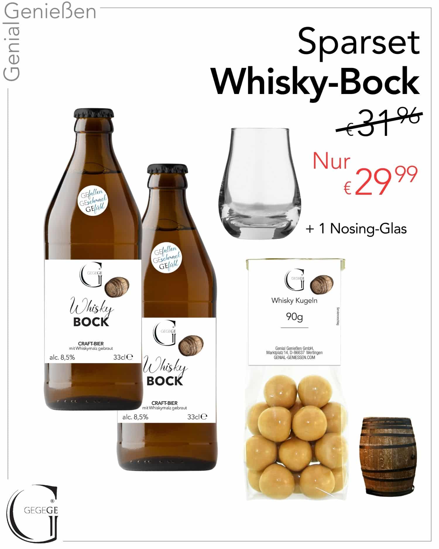 Das Set enthält zwei Flaschen Whisky-Bock Bier, einen kräftigen, malzbetonten Bock mit feinen Fassnoten und einem komplexen Aromenspiel. Nuancen von Malz, Holz und Whisky entfalten sich vollmundig und machen jede Verkostung besonders. Dazu passen die Whisky-Kugeln aus weißer Schokolade mit fein abgestimmter Whisky-Creme und einem Hauch Karamell – ein harmonisches Geschmackserlebnis, das den Bock ideal ergänzt. Abgerundet wird das Set durch ein hochwertiges Nosing-Glas, das die Aromen perfekt zur Geltung bringt und den Genuss stilvoll inszeniert.