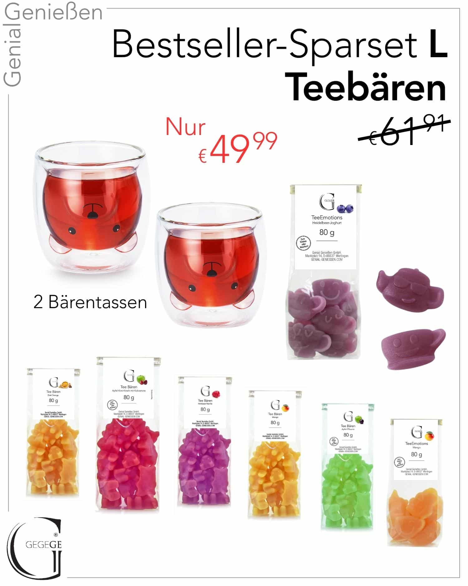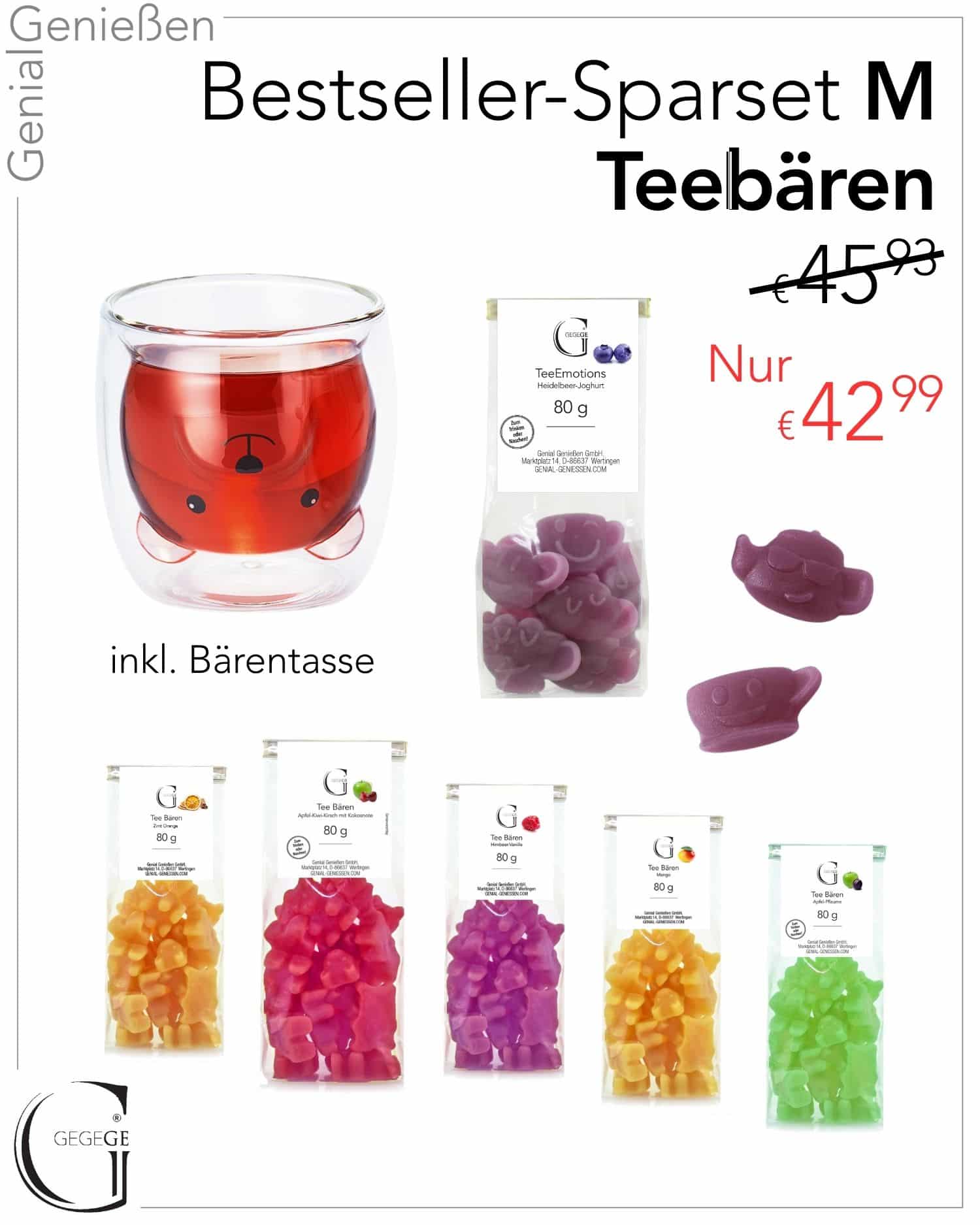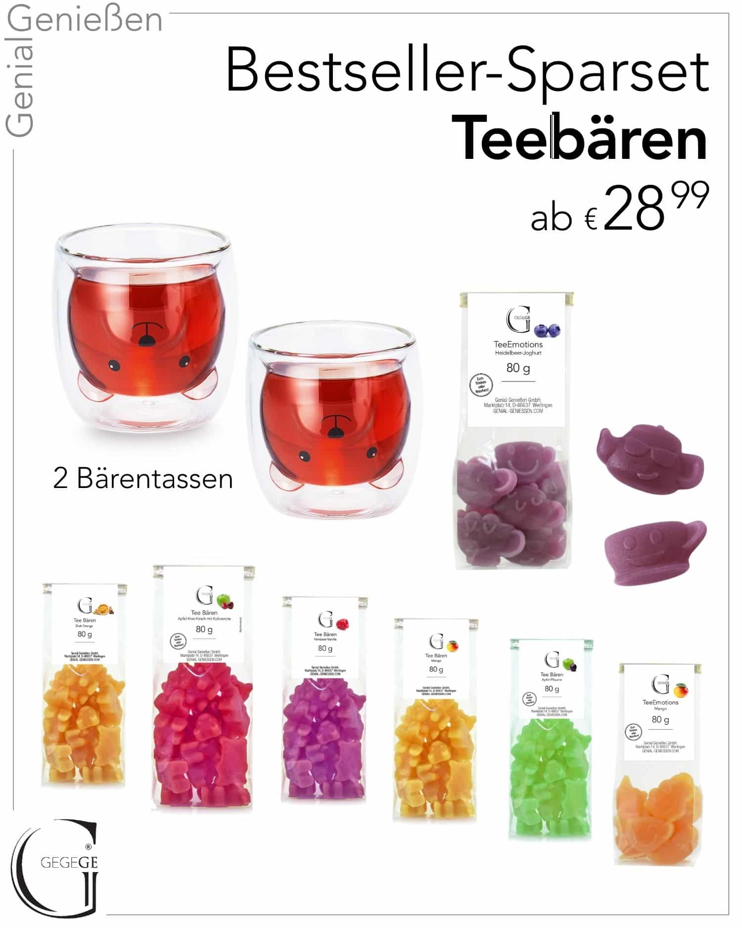 Anwendungstipps - Lieferung in 1-3 Werktagen (B2C)Herkunft: Wertingen, Deutschland.Wir präsentieren unsere Teebären-Bestseller in einem Set. Was für eine geniale Idee! Genieße die Teebären als herrlich-leckeres Heiß- & Kaltgetränk oder vernasche sie einfach so. Ein vielseitiges Geschmackserlebnis, das jeden Moment verzaubert!