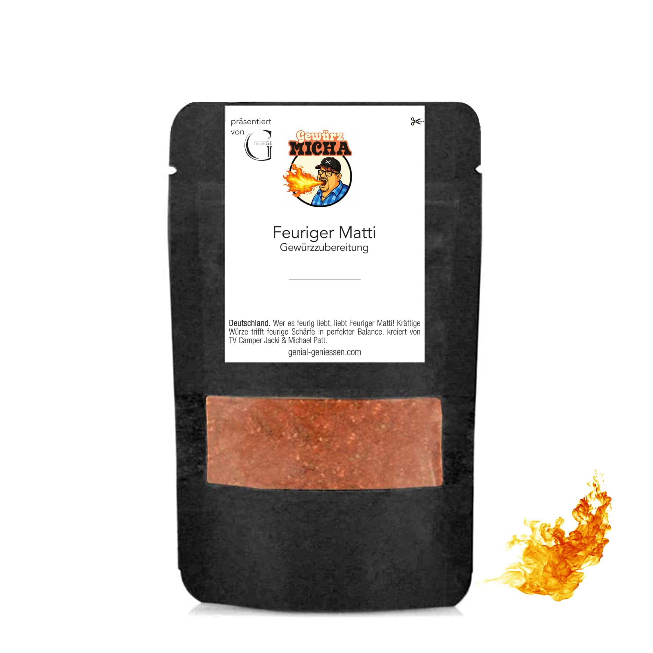 Anwendungstipps - Lieferung in 1-3 Werktagen (B2C)Herkunft: Deutschland.Wer es feurig liebt, liebt Feuriger Matti! Intensiv, würzig und mit spürbarer, aber ausgewogener Schärfe. Eine kraftvolle Mischung mit aromatischer Tiefe und einem lebendig-feurigen Charakter 🔥. Kreiert von TV Camper Jacki & Michael Patt.