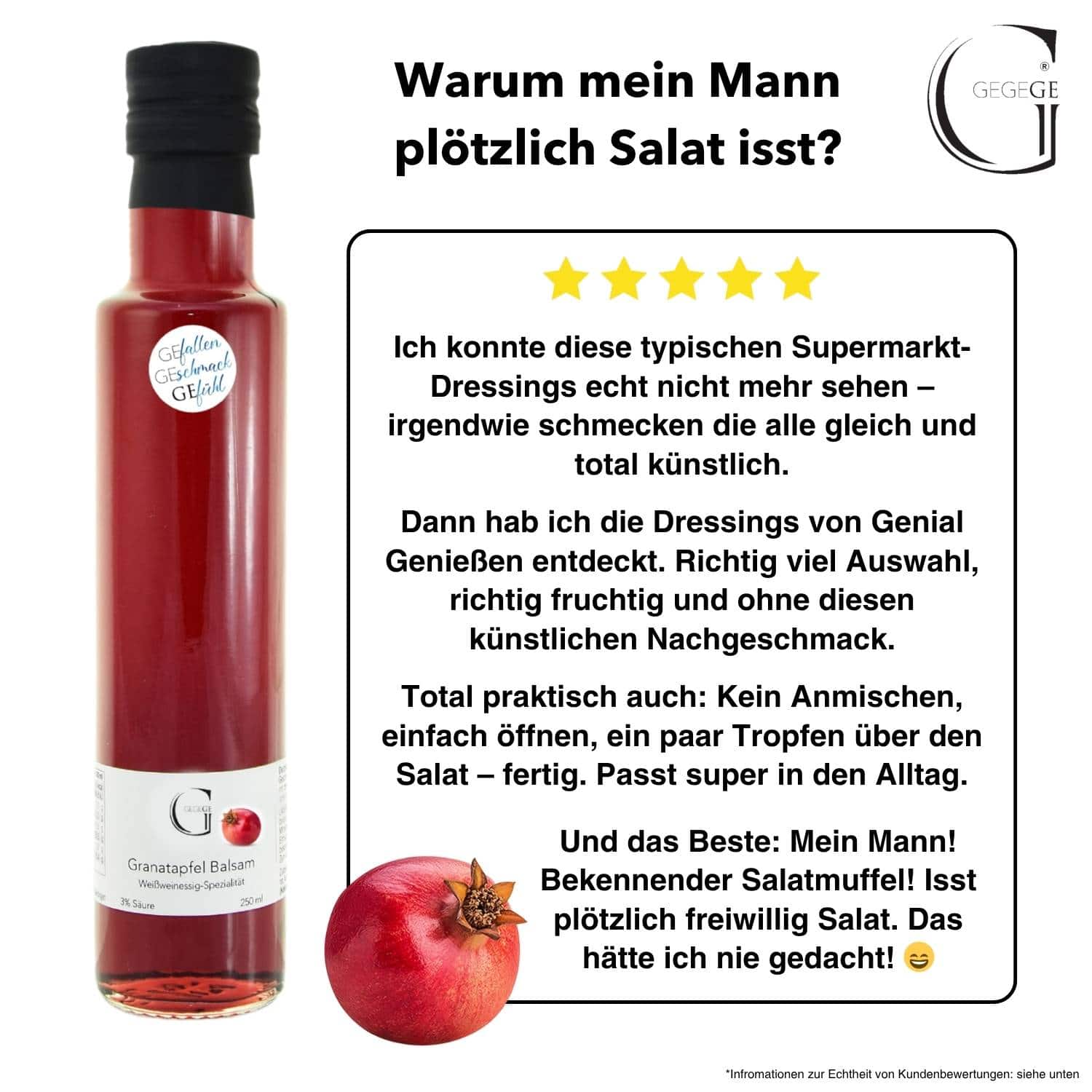 Anwendungstipps - Lieferung in 1-3 Werktagen (B2C)Herkunft: Pfalz.Der Granatapfel Balsam ist eine Symphonie des guten Geschmacks. Milder Weinessig als Basis vereint mit dem fruchtintensiven Aroma von Granatapfel und dessen süßlieblichem Geschmack.
